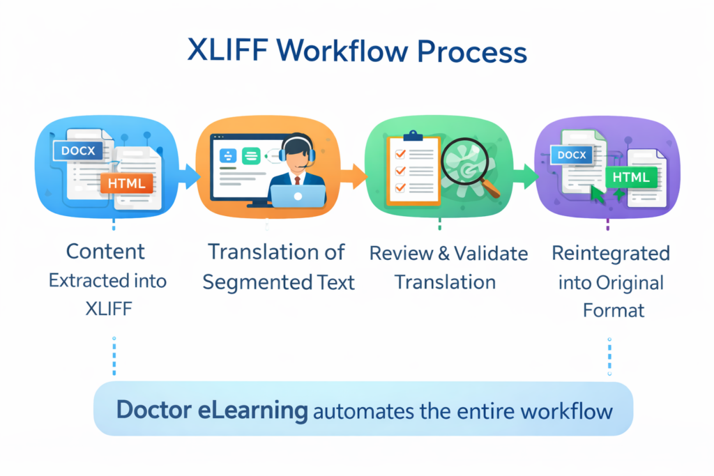 XLIFF translation refers to the process of translating content using the XML Localization Interchange File Format. Unlike basic translation methods, XLIFF separates content from design and code, making it easier to manage multilingual projects. Therefore, it is widely used in eLearning, software, and website localization. Moreover, tools like Doctor eLearning enhance this process by ensuring accuracy, speed, and formatting preservation.